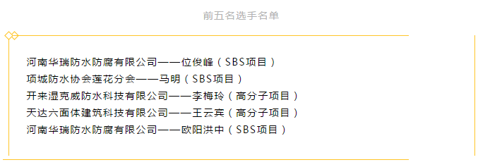 經(jīng)過一天的激烈爭鋒,最后河南建筑防水協(xié)會會長陳寶貴發(fā)表講話并宣讀競賽結果:高分子項目第一名則是來自開來濕克威防水科技有限公司的李梅玲,吳志強榮獲高分子第三名的好成績,可喜可賀!期待他們在全國復賽中再次爭鋒,再創(chuàng)佳績!