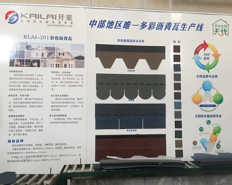 KLAI-201彩色瀝青瓦是以玻璃纖維氈為胎基,經(jīng)浸涂中石化優(yōu)質(zhì)石油瀝青后,一面覆蓋燒結(jié)彩色礦物粒料、另一面撒以隔離材料所制成的瓦狀屋面防水片材。公司擁有中部地區(qū)特有的彩色瀝青瓦生產(chǎn)線,對外提供定制。采用在高溫下陶化而成的彩色燒潔砂,產(chǎn)品采用全背膠生產(chǎn)工藝。彌補了瀝青瓦抗風性能差的缺點,造型多樣,色彩豐富。