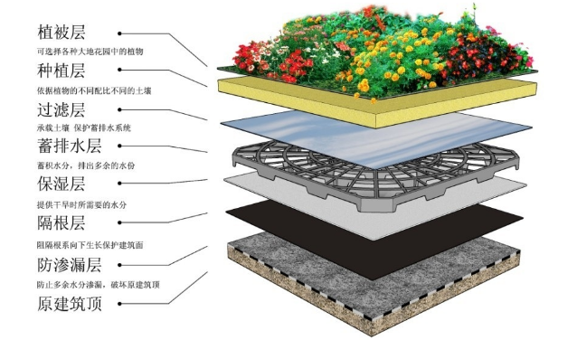 要不要蓄水層應(yīng)依覆土厚度和地區(qū)氣候而定。當(dāng)覆土厚度大于50cm,有足夠的自身蓄水能力,可以不設(shè)蓄水層,只在土層上設(shè)排水層即可。當(dāng)覆土小于30cm厚,自身蓄水較少,數(shù)天無(wú)雨土層便干旱,應(yīng)加設(shè)蓄水層以備干旱時(shí)反滲、潤(rùn)澤種植土。在少雨或暴雨地區(qū),應(yīng)考慮設(shè)置蓄水層,目的是盡量不讓雨水排走。